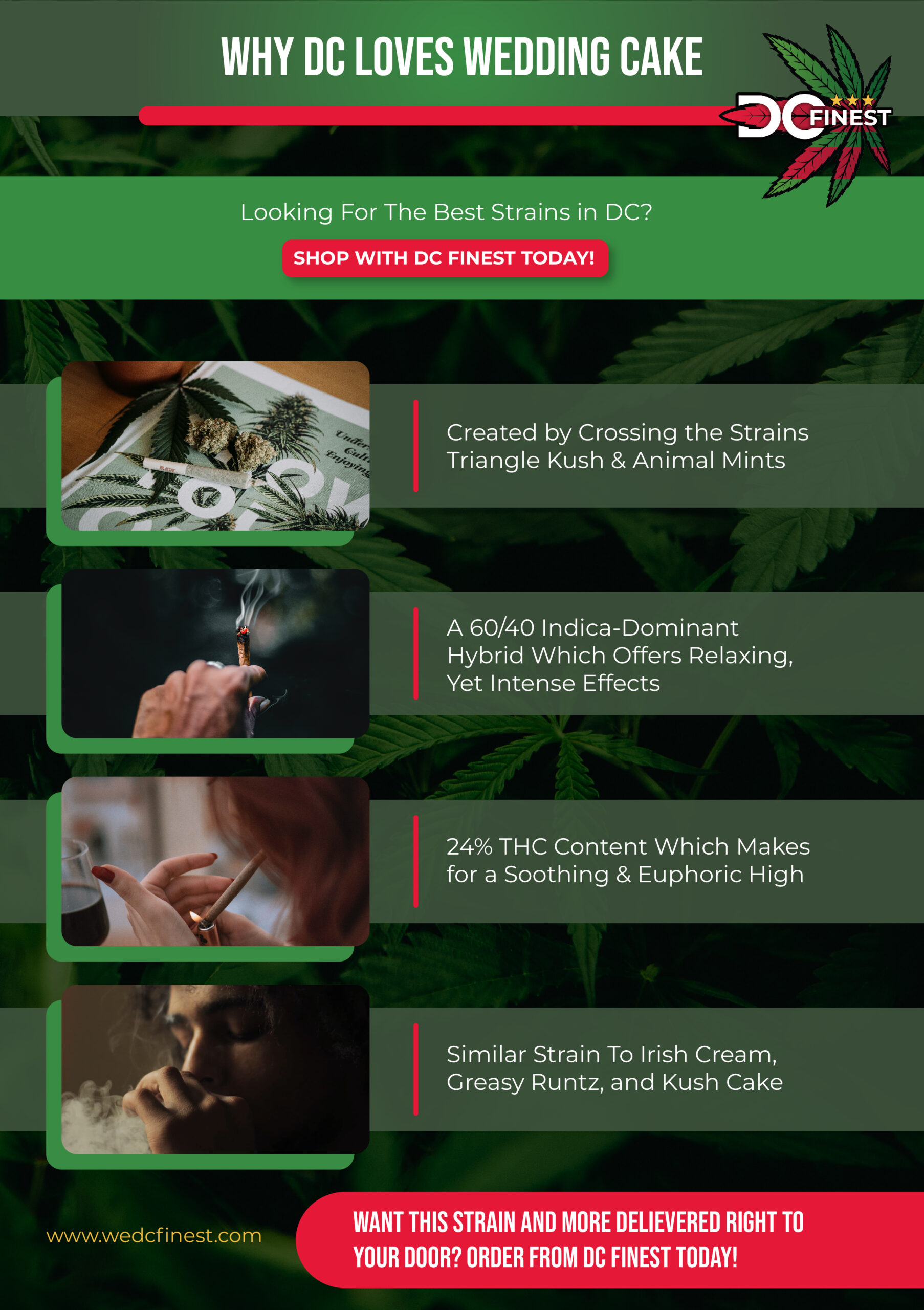 Looking for high potency marijuana strains that can be delivered straight to your door? At DC Finest, we offer DC cannabis delivery so that you can enjoy your flower whenever you want! Speaking of flower, we have strains that are sure to become your favorite, one being Wedding Cake. Although this strain has a friendly name, it packs a punch, as it is an Indica-dominant hybrid whose effects you are sure to love! Read on to learn more about this amazing strain, and visit us online today to see what else we have in store for you!
